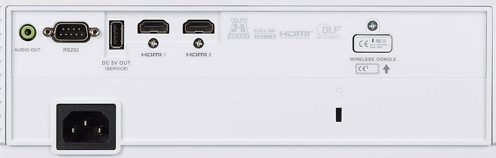 2x HDMI (2.0b), analóg audió ki (Mini Jack), USB-A Táp (5V/1,5A), USB-A (rejtett WLAN adapternek), RS232 (D-Sub9),