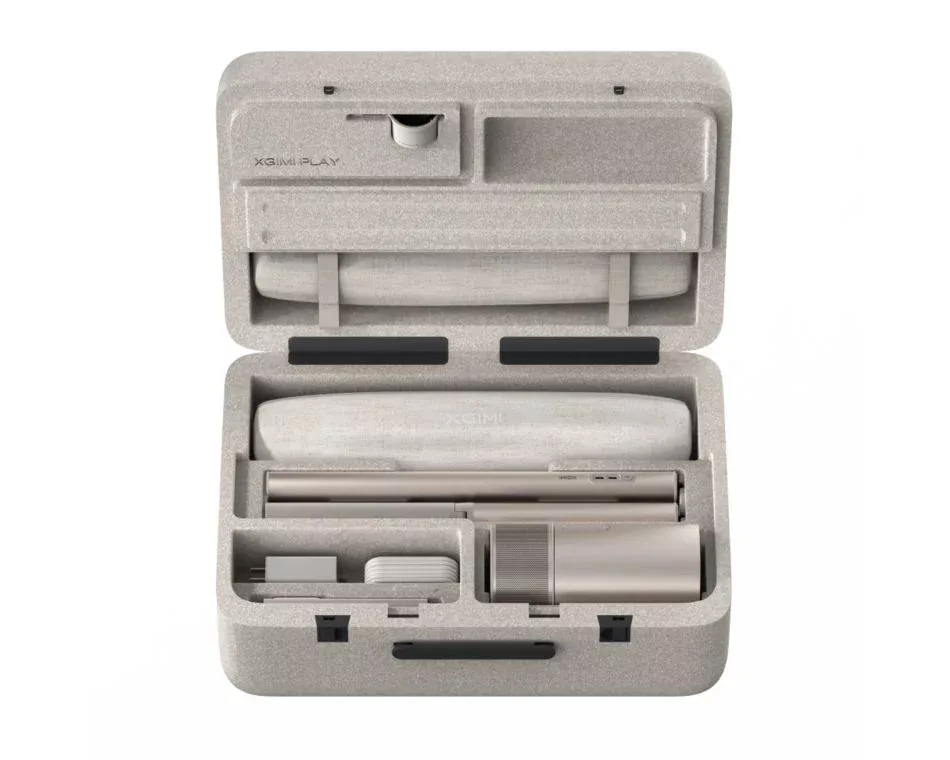 Az alapváltozattól eltérően az XGIMI MoGo 3 Pro 4in1 változat egylimitált kiadású karácsonyi tokot, egy kreatív optikai szűrőt, egy különleges lencsét és egy PowerBase állványt is tartalmaz, amely egyszerre padlóállvány és powerbank. Az állvány egy 20000mAh-s akkumulátort tartalmaz, és lehetővé teszi, hogy a MoGo 3 Pro-t egészen egyszerűen táplálhassa. Ez jól jöhet, ha sokat utazik a projektorral. Az állvány azonban nem alkalmas kültéri használatra, de ha a projektort otthon vagy az irodában tervezi használni, és szüksége van egy integrált megoldásra, amely vezetékes kapcsolat nélkül működik, akkor ez egy praktikus lehetőség, amely csak a 2in1, 3in1 és 4in1 csomag részeként érhető el.