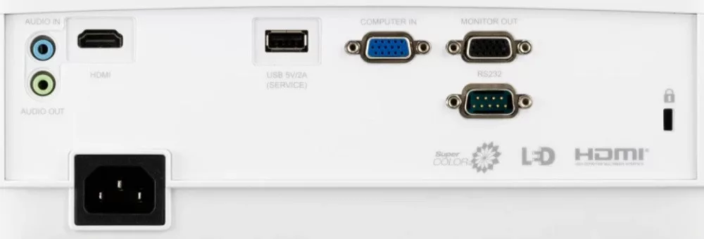 HDMI (v1.4a ), VGA be és ki (2x D-sub15), audió be és ki (2x Mini Jack), USB-A SERVICE/táp (5V/2A), RS232 (D-Sub9)