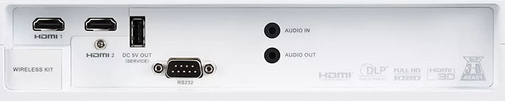 2x HDMI (1.4 ver), audio be és ki (2x MiniJack), 2x USB (1x rejtett tokban a vezeték-nélküli adapterhez, 1x 5V/2A, Type A), RS232 (D-sub9)