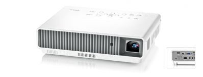 3D, LED/lézer technológia. HDMI, Low lamp mode (-20% fényerő és zaj), vetítés USB pendrive-ról, WLAN-ról, hordtáska