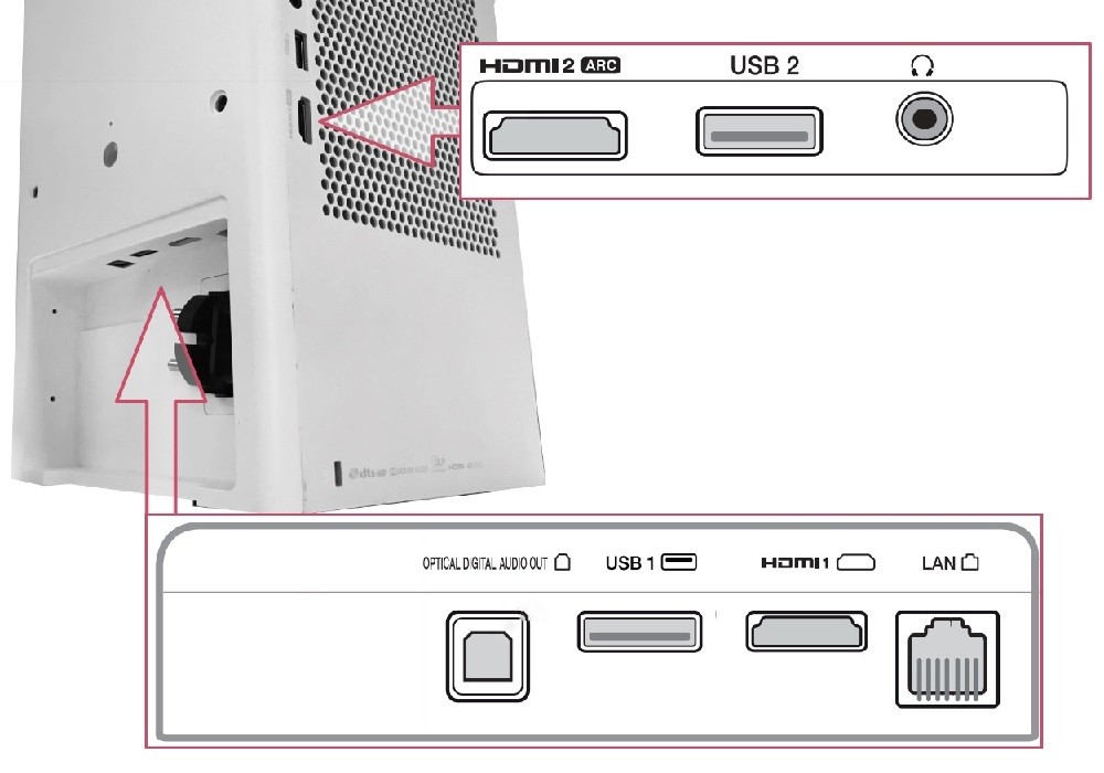 2x HDMI (ver. 2.0a/HDCP2.2, 1xARC), optikai SPDIF audió ki (Toslink), analóg audió ki (Mini Jack), LAN (RJ45), USB 2.0 5V/0,5A (A), USB 3.0 5V/1,5A (A), Beépített Wi-Fi és Wi-Fi Direct kapcsolat