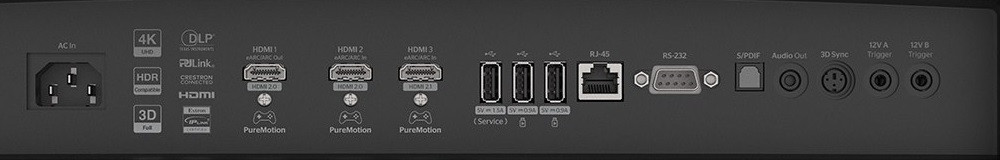 1x HDMI 2.1, 2x HDMI 2.0 (1x eARC/ARC), S/PDIF optikai (Toslink) és Mini Jack audiokimenetek, 3x USB Type A (1x 5V/1,5A táp/szerviz, 2x 5V/0,5A olvasó), RS232 (D-Sub9), Ethernet LAN (RJ45), 2x 12V Mini Jack Trigger kimenet, 3D Sync (DIN) kimenet