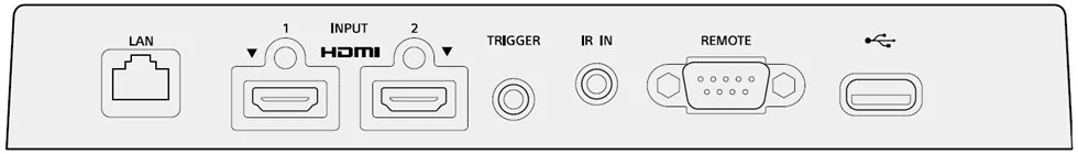 2x HDMI 2.1 (HDCP2.3, 4K/120Hz, ALLM), USB TypeA (5V/0,5A frissítéshez), Trigger (Mini jack DC 12V/0,1A), LAN (RJ45), RS-232C (D-sub9), IR bemenet (Mini jack)