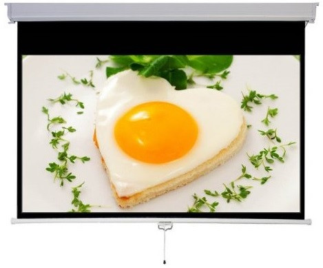 Fehér tokos, kézi mozgatású, falra és mennyezetre szerelhető vászon, körbe 3 cm-es fekete kerettel.