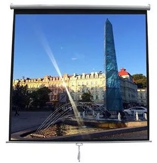 Fehér tokos, kézi mozgatású, falra és mennyezetre szerelhető vászon, körbe 3 cm-es fekete kerettel.