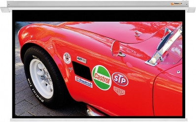 Fehér acél tokos, motoros mozgatású, álmennyezetbe építhető, 1,0 nyereségű (Gain) vetítővászon 5-5 cm oldalsó és alsó fekete kerettel, 31 cm fekete kifutóval, Smart Control System vezérléssel (Fali kapcsoló, RF Távvezérlő, RS 232 és Trigger), 109" látható képátlóval; Model No: funP.IC.161.244.MW
